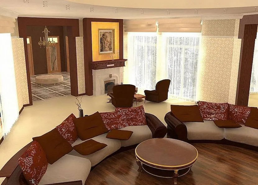 Центром кругового расположения выступает потолочный светильник, стол или ковер. От фокусной точки мебель ставят по кругу. Метод используют при наличии полуовальных стен и для крупных комнат. В размещении придерживаются баланса, учитывают особенности декора или размер компонентов.