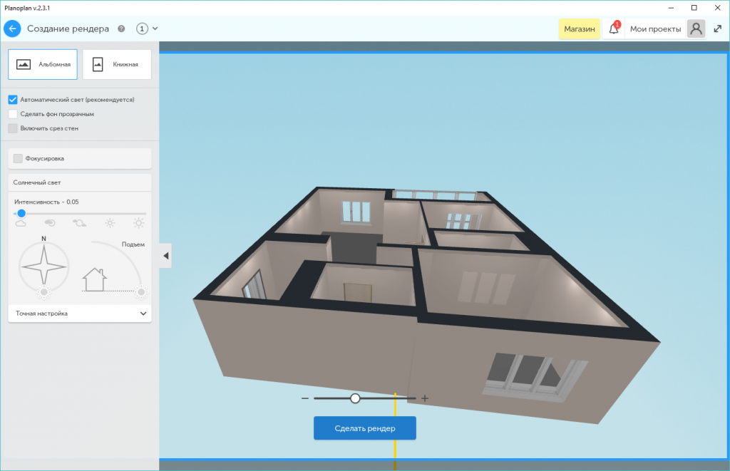 Оформление на русском языке, что особенно удобно. По созданному проекту можно «прогуляться», используя функцию виртуальной экскурсии. 3D планировщик предложит сохранить результат, отредактировать его или отправить на печать.