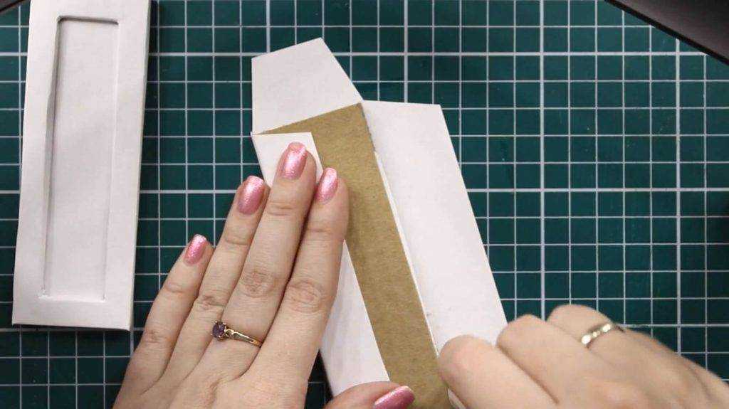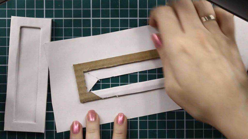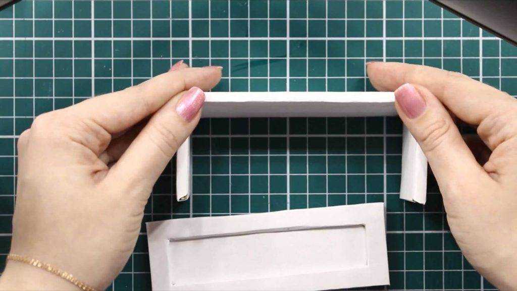 Проводим клеем по бумаге внутри рамки и аккуратно отгибаем бумагу на рамку. Вырезаем из белой бумаги деталь 4*12 см. и наклеиваем на переднюю картонную деталь с одной стороны. Далее, сверху на рамку накладываем вторую переднюю деталь бумагой вниз и обклеиваем перед ящика бумагой.