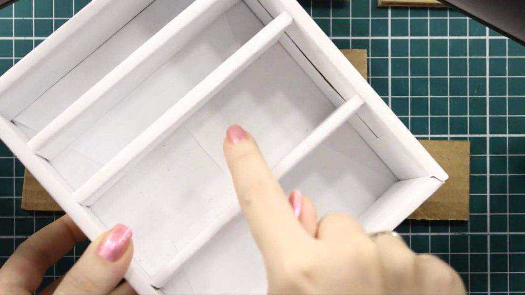 Вырежьте из картона канцелярским ножом стенки для полок, а также боковые и заднюю стенку самого комода по вашим собственным размерам. Аккуратно склейте конструкцию с помощью скотча или клея. Учитывайте то, что между основной боковой стенкой и стенками ящичков должно быть небольшое пространство, чтобы ящики могли свободно выдвигаться и вставать на свои места.