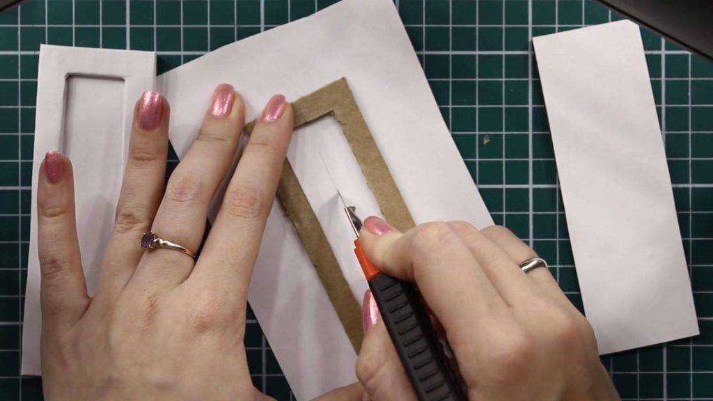 Проводим ножом разрез, отступив по 1 см. от рамки. Делаем в конце линии разреза треугольник.