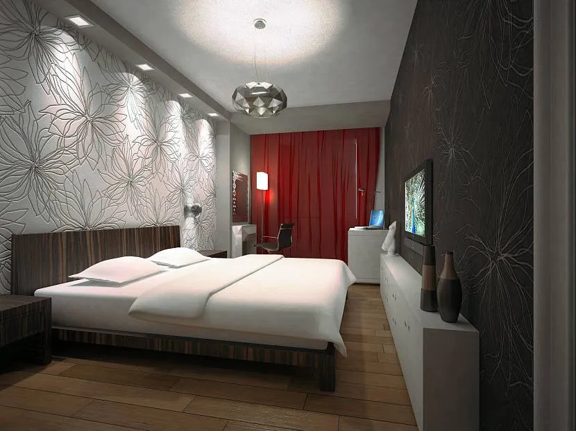 Кровать располагается поперек спальни, у длинной стены. Напротив устанавливается телевизор. Для этого интересно организовать нишу, а сверху по краю пустить точечное освещение. Изголовье спального ложа тоже расположите в нише, с применением светильников. Заднюю стенку ниши обклейте обоями, например, узора цветущего дерева сакуры.