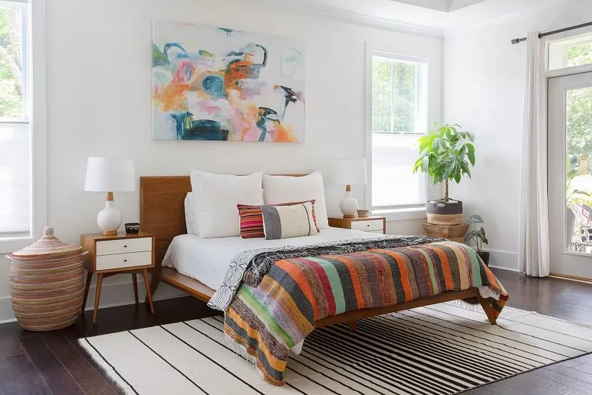 Дополнительные детали. Ложе украшают дополнительным красивым одеялом (вязаным или стеганым), сложенным в длину и размещенным в изножье кровати. Декоративный элемент можно расстелить, как основное одеяло, и отогнуть их край вместе.
