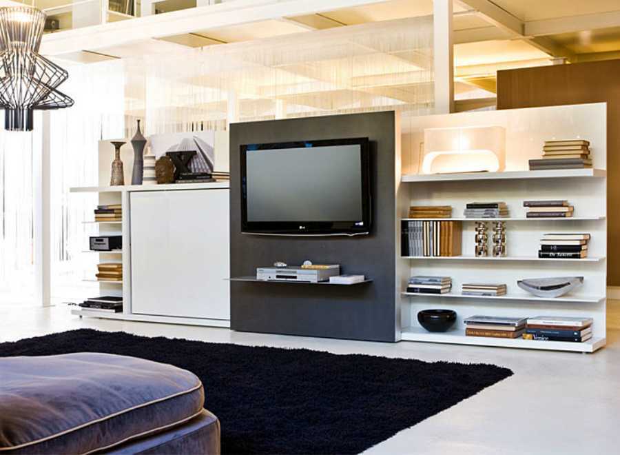 Наверняка в зоне гостиной будет присутствовать корпусная мебель – например, тумба под телевизор, стенка-горка или стеллаж, комод и т.д.