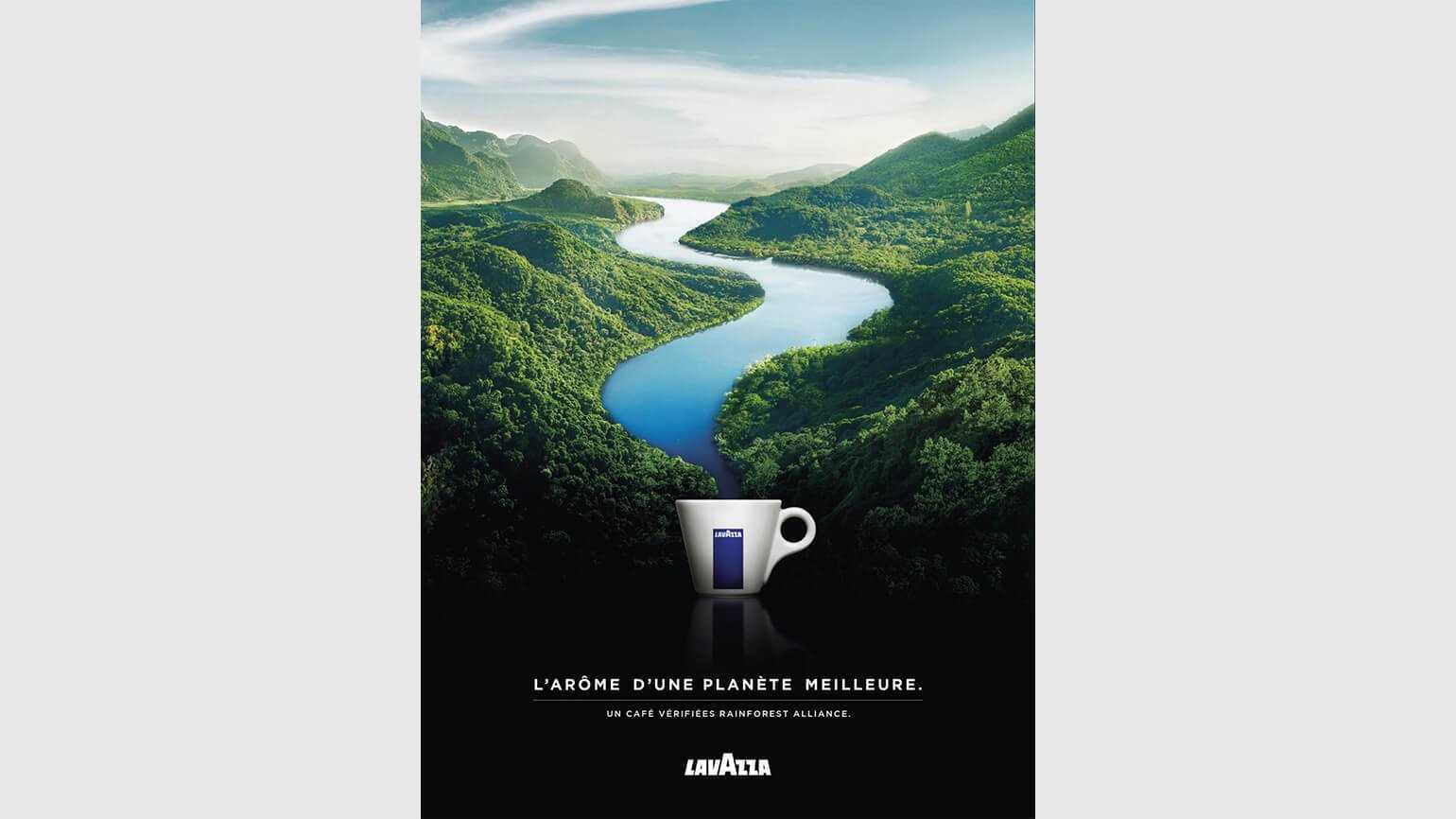 2. Заменить один объект другим. В этой рекламе река — это пар, исходящий от кофе: