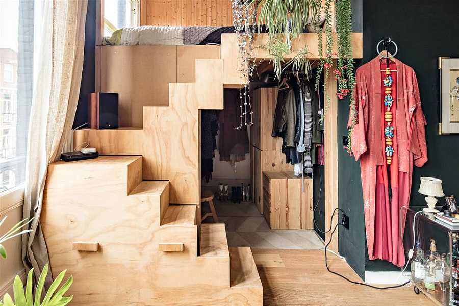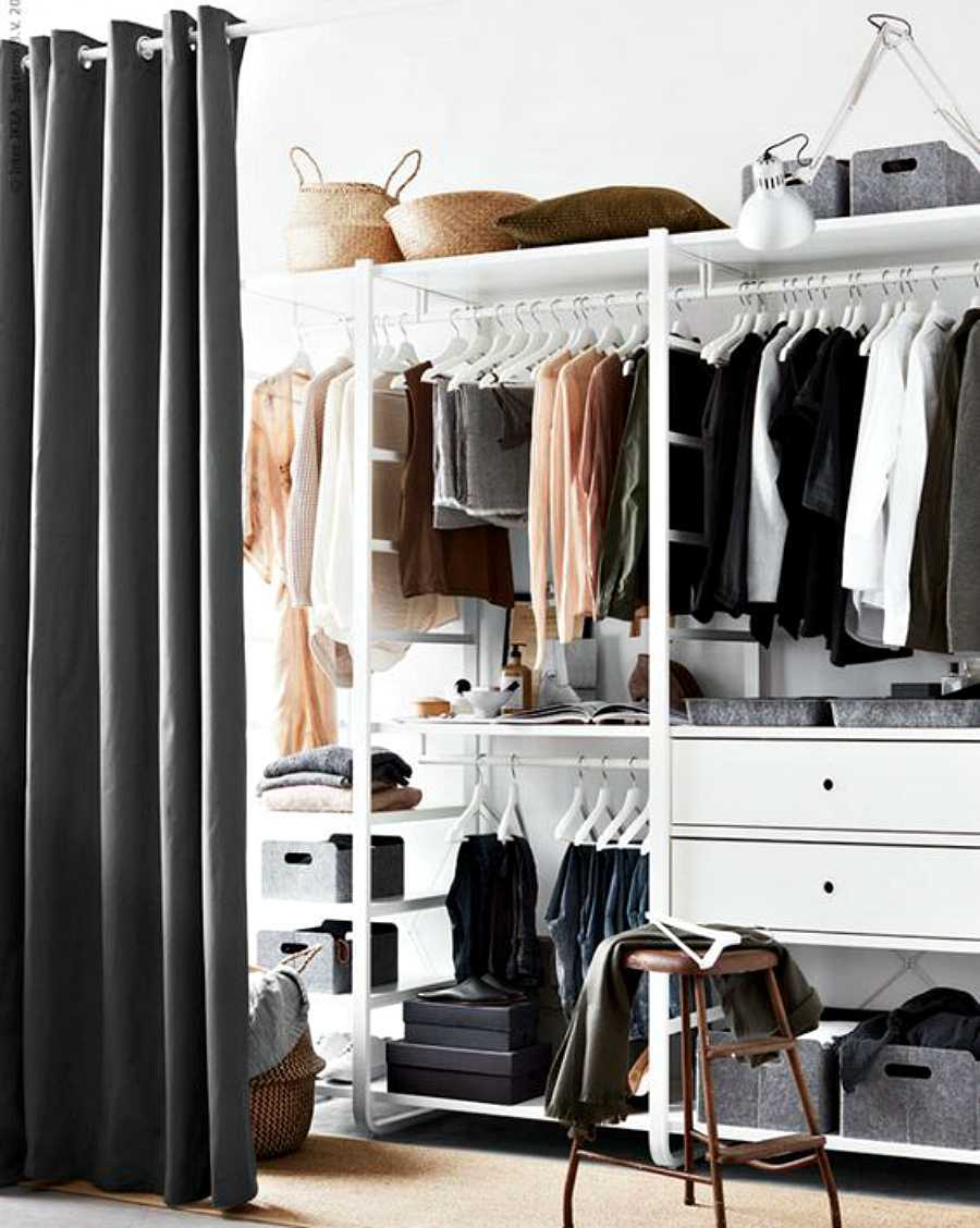 Данный метод является гениальным по своей простоте, бюджетности и эффективности. Никто не догадается, что за обычными шторами прячется большая ниша с одеждой, обувью и аксессуарами (хотя наполнение, по сути, может быть любым). Этот вариант идеален для крохотных комнат, так как не приходится тратить пространство на двери для шкафа. Кроме того, площадь хранения получится намного больше.