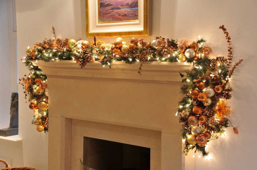 - Гирлянды сплетенные из еловых ветвей, украшенные электрическими гирляндами, и различными елочными игрушками, безусловно, могут стать лучшим и основным декором помещения. Одну такую гирлянду можно уложить сверху на каминную полку, а другую подвесить на его торцевой части.
