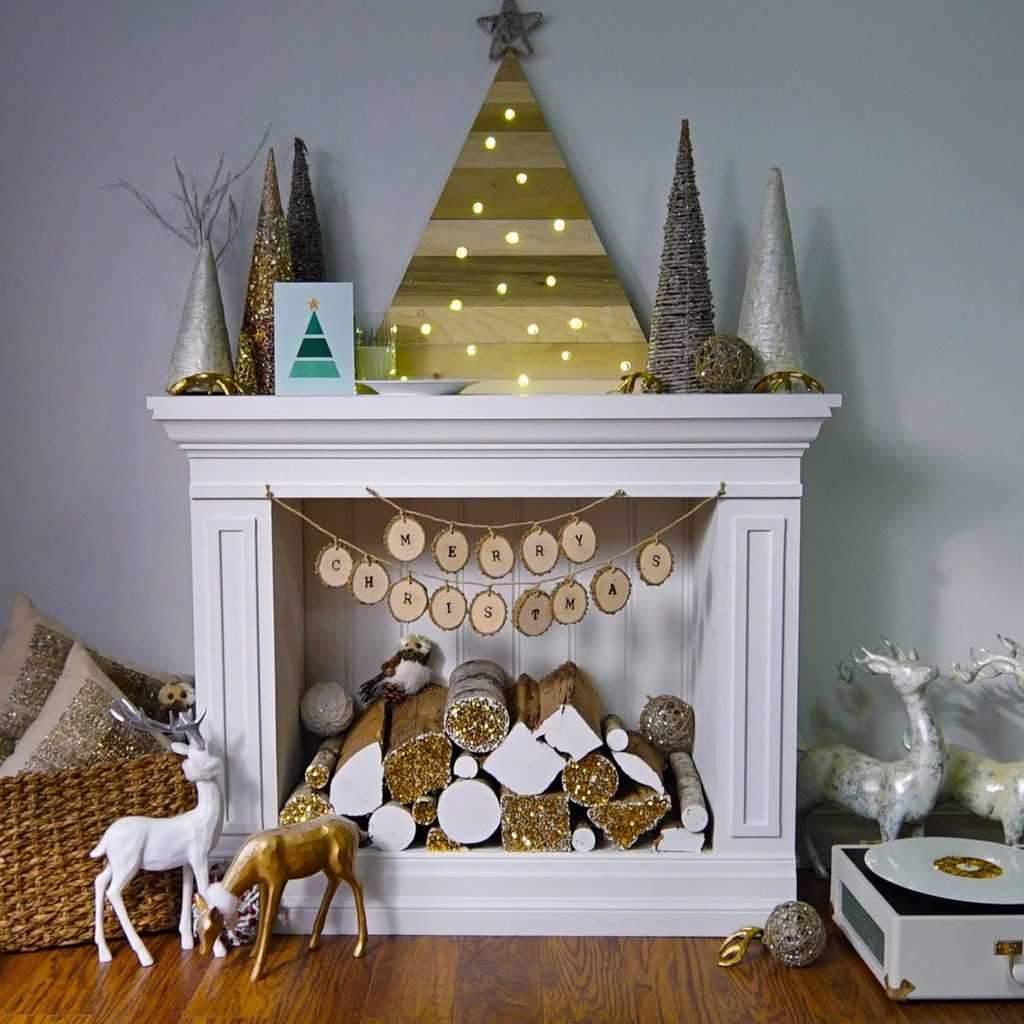 Новогоднее настроение создаст и горстка «дров», сложенных внизу очага, словно пламя вот-вот загорится. Подкрашенные камни будут выглядеть настоящим пеплом, а спрятав между ними гирлянду или одну светодиодную ленту, создать эффект тлеющих углей.