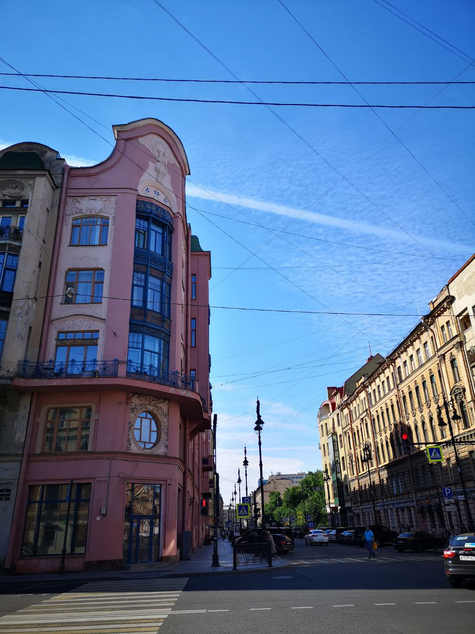 На улицу дом выходит светлым, почти белым фасадом. Но зайдя во двор, вы увидите, что внутренние стены переливаются разными оттенками фиолетового, синего и зелёного и напоминают толщу воды. А массивные трубы на крыше похожи не то на шахматные фигуры, не то на сюрреалистические образы с картин Дали.