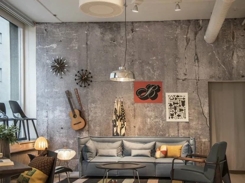 - Если акцентом интерьера будет бетонная стена, ее выравнивают и чистят, освобождая от штукатурки и обоев. Поверхность обязательно пропитывают гидрофобным составом или покрывают бесцветным лаком.