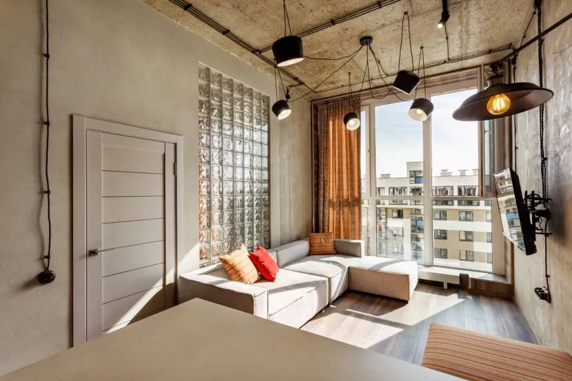- Стилистика лофта подразумевает наличие хотя бы одной кирпичной или бетонной стены.