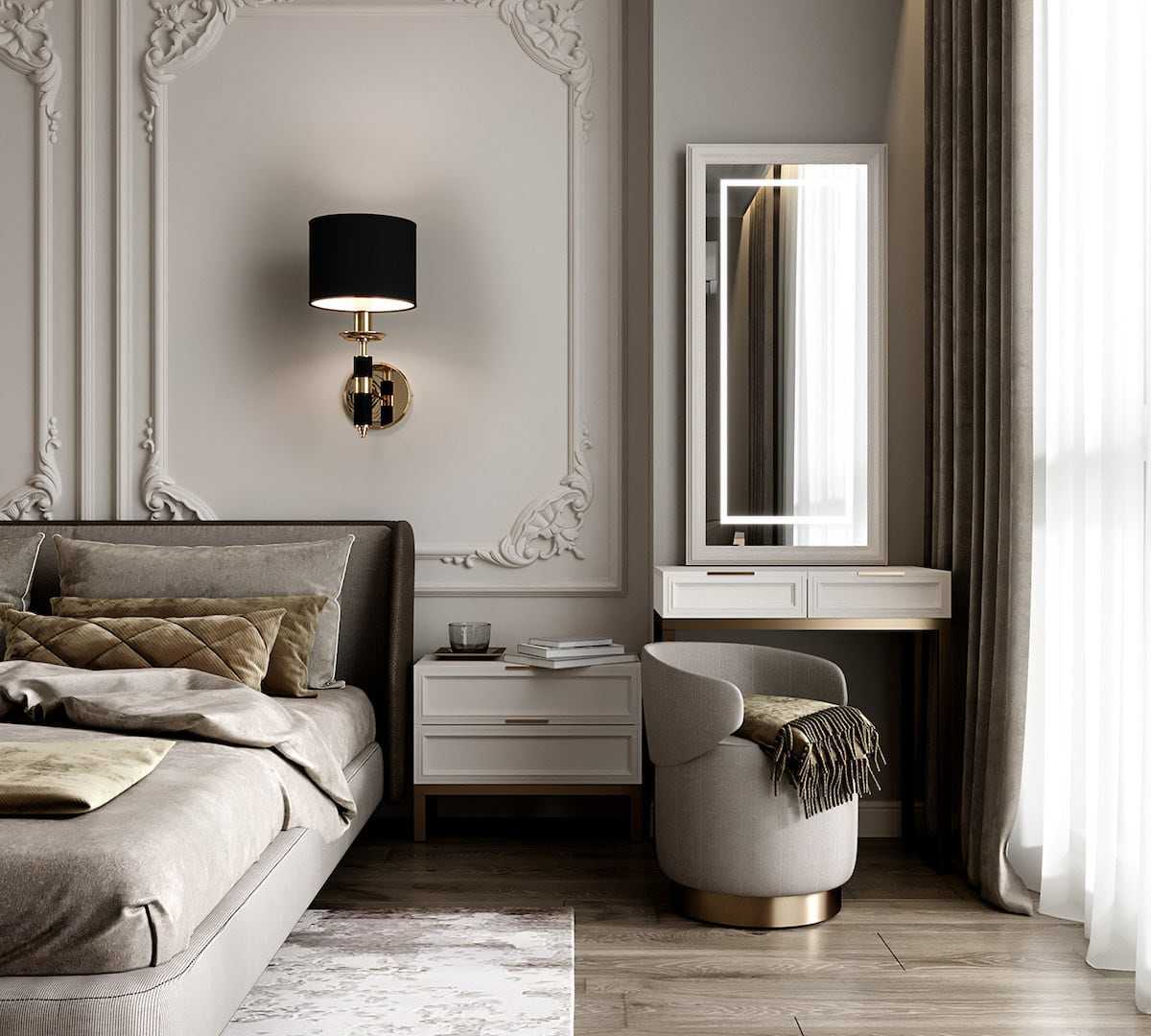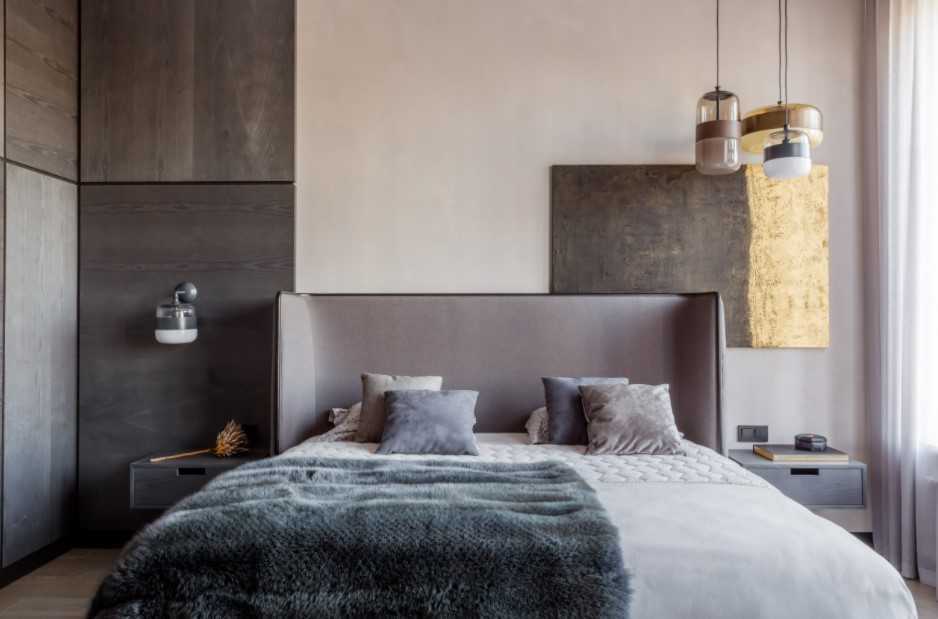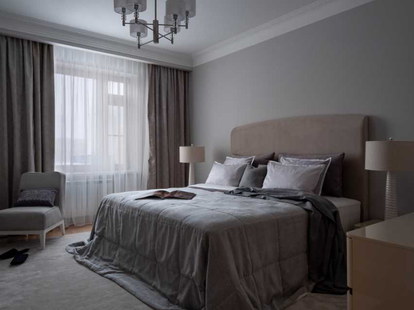 Место для отдыха и сна безоговорочно должно быть комфортным, атмосферным, безопасным, спокойным и красивым. Для воплощения гармоничных интерьеров спальни нам даны в помощь современные актуальные стили. Популярный и ненавязчивый хай-тек в серой, бежевой и черно-белой цветовой гамме с абстрактным мотивами и хромированными деталями в интерьере.