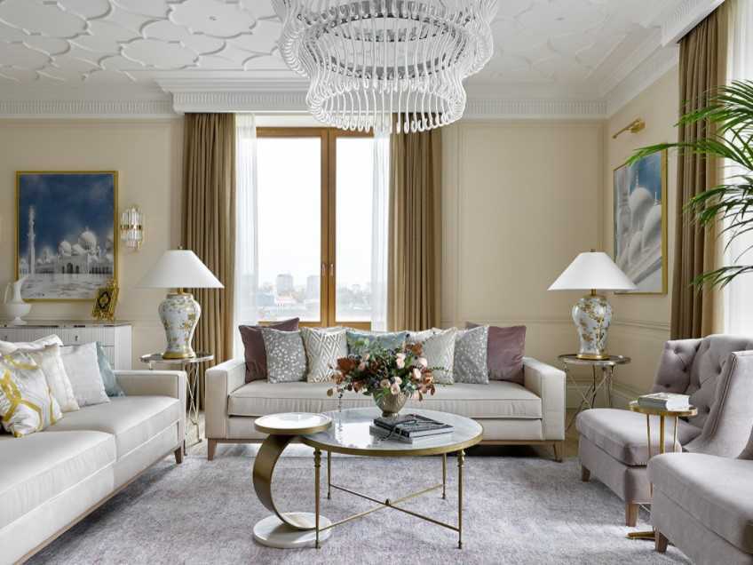 Беспроигрышный вариант для гостиной во все времена – интерьер в классическом стиле. Если учитывать модные тенденции этого года, то следует избегать слишком вычурных декоративных элементов, быть осторожными с выбором оттенков и расцветок, цветных и ярких акцентов.