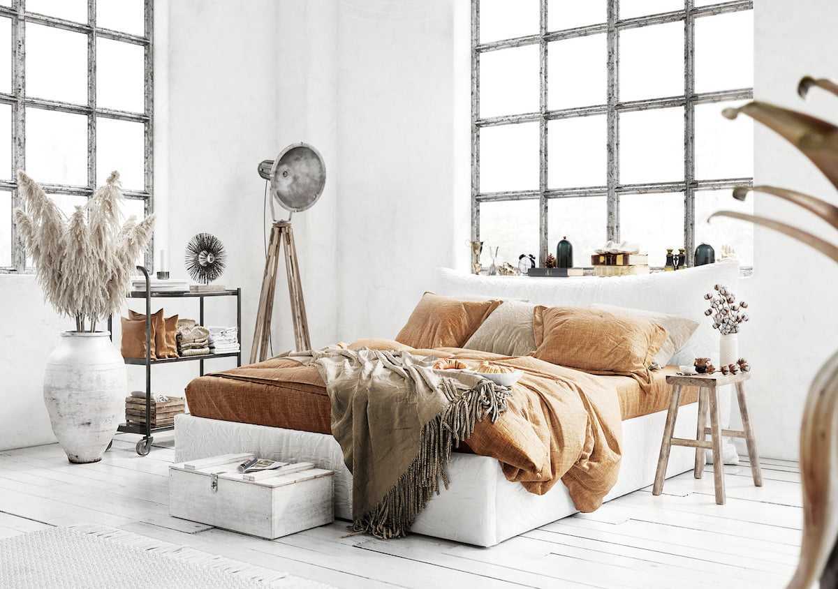 Белая однотонная спальня в стиле скандинавского минимализма абсолютна экологична и чиста, природные материалы в отделке и мебели, декор из камня, напольные комнатные растения в горшках из натуральной глины, натуральный текстиль.