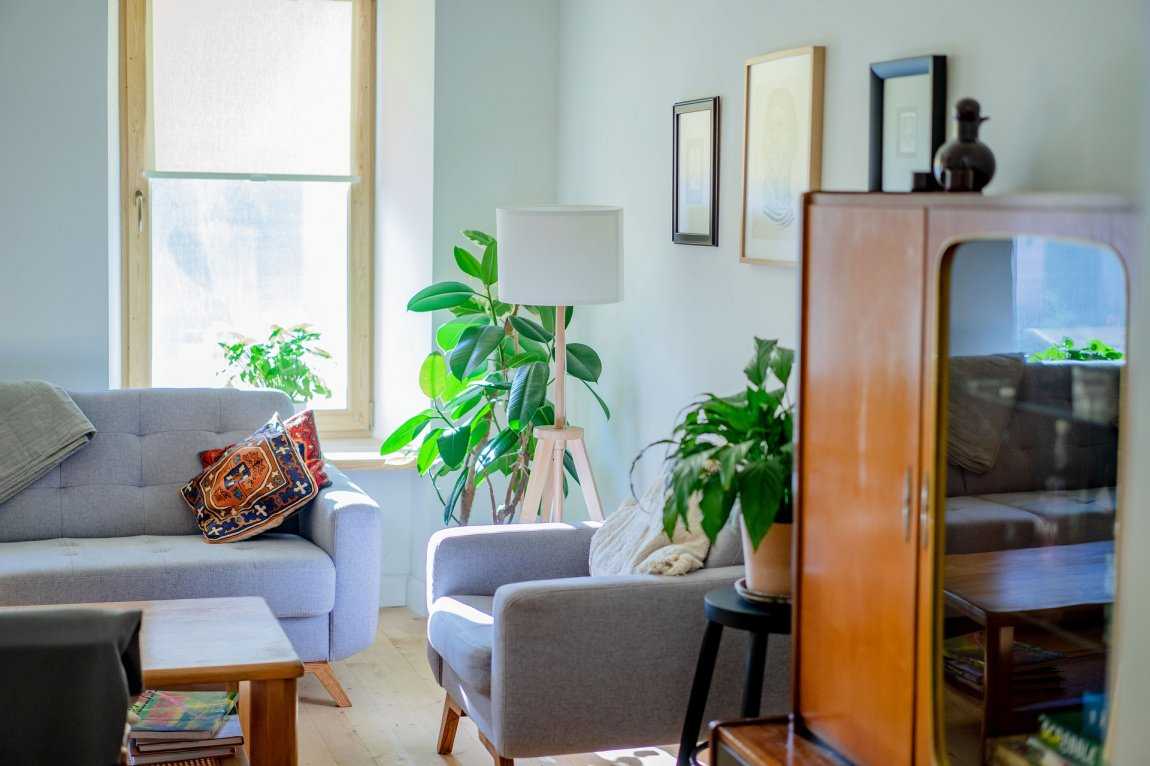 Безупречна классическая гостиная в изысканных серых, коричневых, бежевых тонах с качественным ярким освещением, мебелью из натуральных природных материалов, комнатными цветами и декоративными растениями, красивым качественным благородным текстилем из льна, хлопка или шелка.