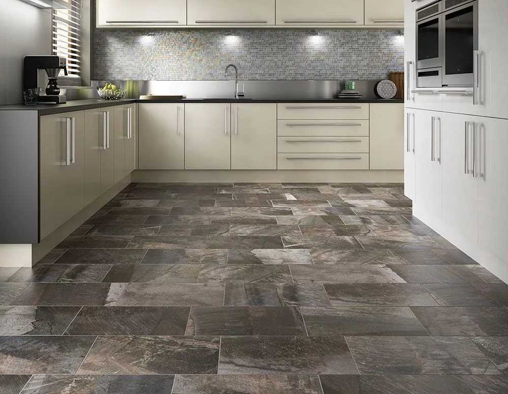 С точки зрения практичности керамическая напольная плитка для влажных помещений — лучший выбор. Она не впитывает никакие вещества. Вода, масло, любая другая жидкость останутся на поверхности до тех пор, пока вы их не уберете. Куда жидкость может впитаться — в швы. А чтобы этого не произошло, выбирайте влагостойкую затирку и хорошо заполняйте швы. По практичности и легкости ухода это кухонное напольное покрытие в числе первых.