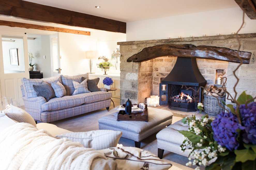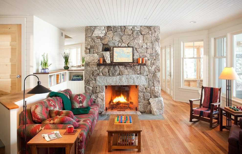 Камин в комнате, оформленной в деревенском стиле, выглядит очень необычно. Основными характеристиками его являются: