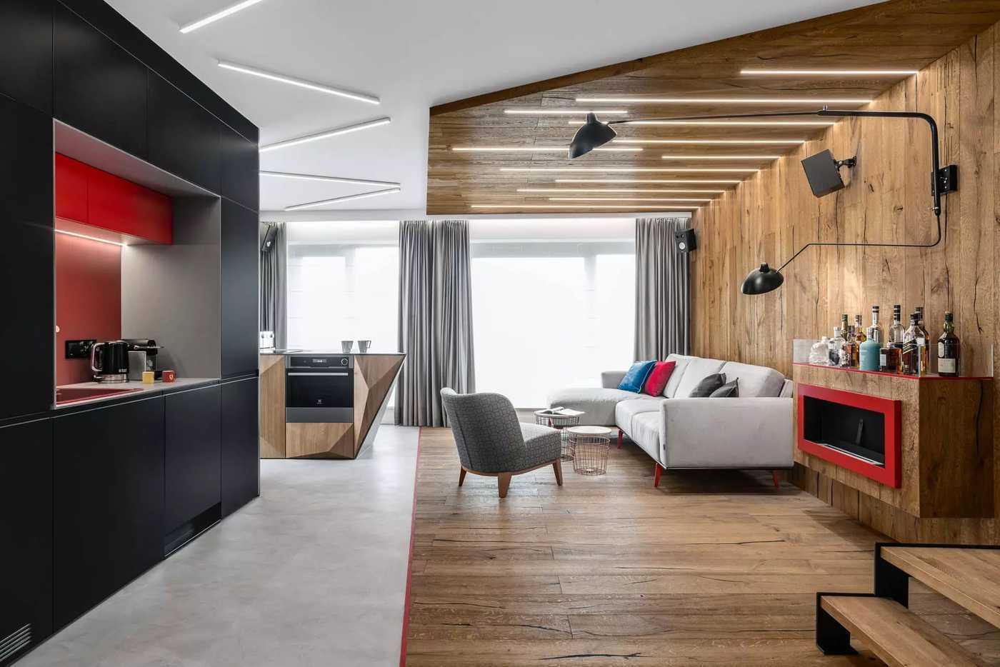 Кухня и гостиная в едином пространстве оформлены совершенно по-разному. Гостиная выделяется благодаря отделки пола, стен и потолка натуральным деревом, в потолок встроена линейная подсветка. В тоже время в другой части комнаты использована совершенно другая цветовая схема. В части кухни доминирует чёрный кухонный гарнитур, а гостиной деревянные поверхности.