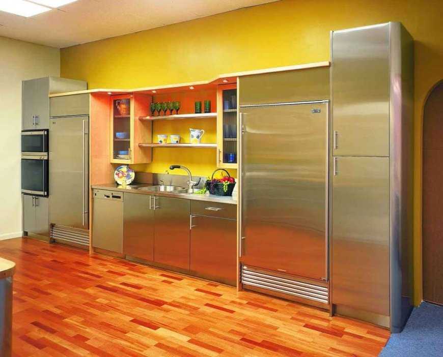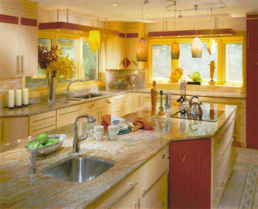 Это цвет солнца и тепла. Кухни в желтой палитре будут смотреться жизнерадостно, и лучше, если помещение будет очень освещенным. Хорошо сочетается с голубым цветом и серебристым металликом.