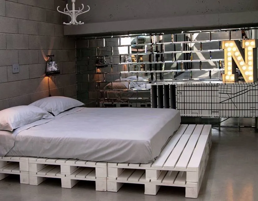 Лофт – стиль творческих людей, в нем используются вещи разных направлений. К примеру, самодельная кровать из поддонов одинаково хорошо будет смотреться и с креативной акцентной стеной из зеркальных «кирпичиков», и с винтажными креслами или светильниками.