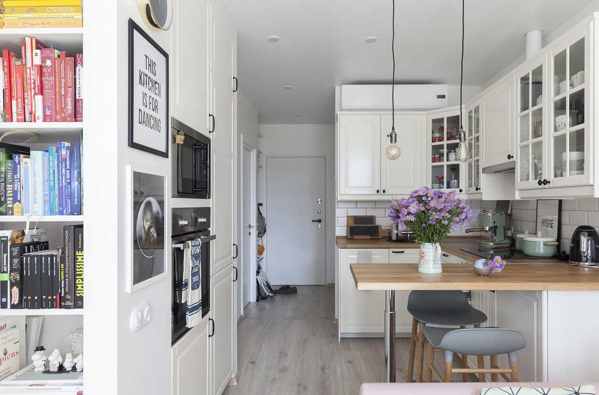Визуально отделить кухню от гостиной поможет различное оформление стен, пола, потолка, а также: