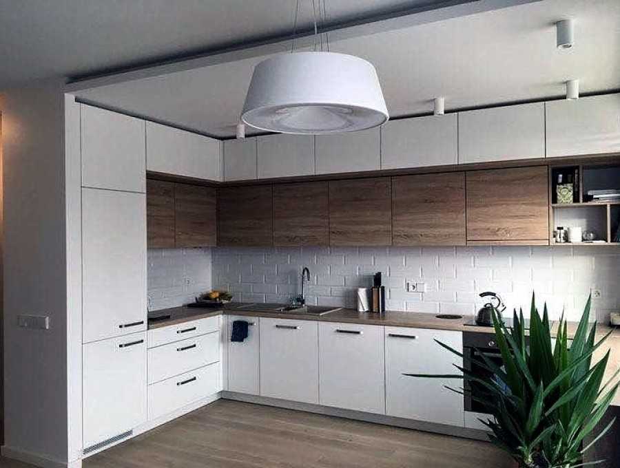 - L-образный тип — основным преимуществом является наличие свободной зоны для обеденного или рабочего стола. Если этот стол установить, то тип кухни станет считаться островным.