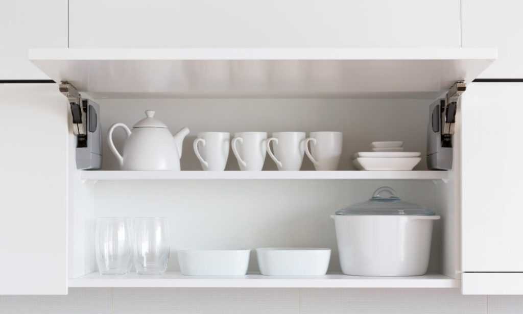 Чашки, бокалы и стаканы, как правило, хранят в верхнем ряду кухонного гарнитура. Для размещения чашек используются полки, на которых столовые предметы располагаются в ряд либо стопками.