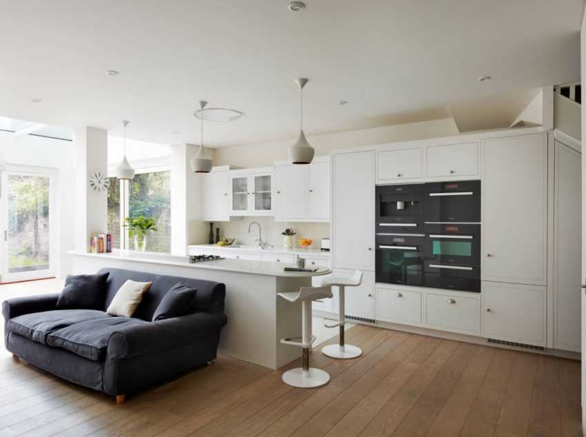 - Мебель. В пространстве между зонами можно поставить барную стойку, кухонный остров, стеллаж, шкаф или диван. Любой из предметов будет выполнять не только роль стены, но и свою основную функцию.