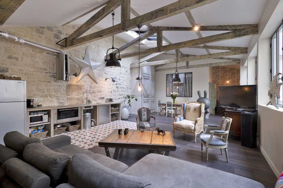 В таком случае лофт будет идти рука об руку с прованским или кантри стилем. Постройте дополнительные ниши, чтобы скрыть высокие потолки (они не добавят уюта комнате), на окна установите белые ставни.