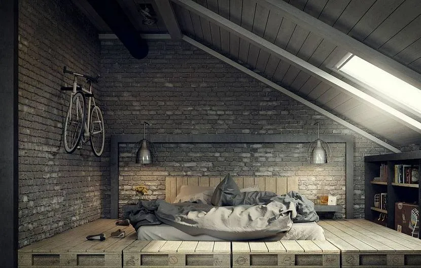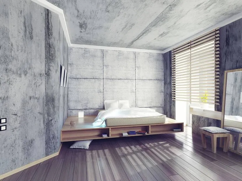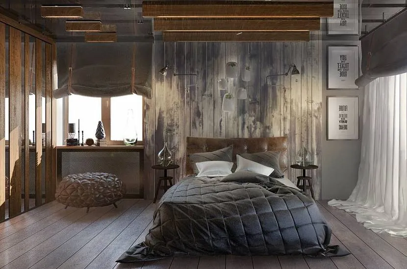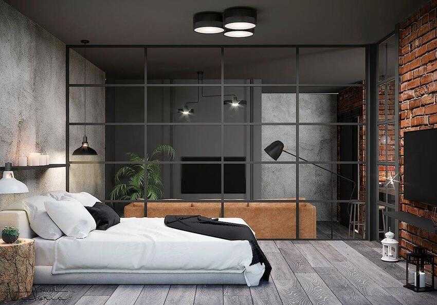 Мебель спальни в грубом оформлении поддерживает общую концепцию – лаконичность и простую геометрию. Кровать и система хранения сливаются со стенами. При помощи металлических стеллажей отделяют зону отдыха от кабинета (учебной части). На фоне интерьера выделяются полки с подчеркнутой шероховатостью дерева или бетона. Встроенные гардеробные не заметны при первом взгляде, часто повторяют текстуру отделки.