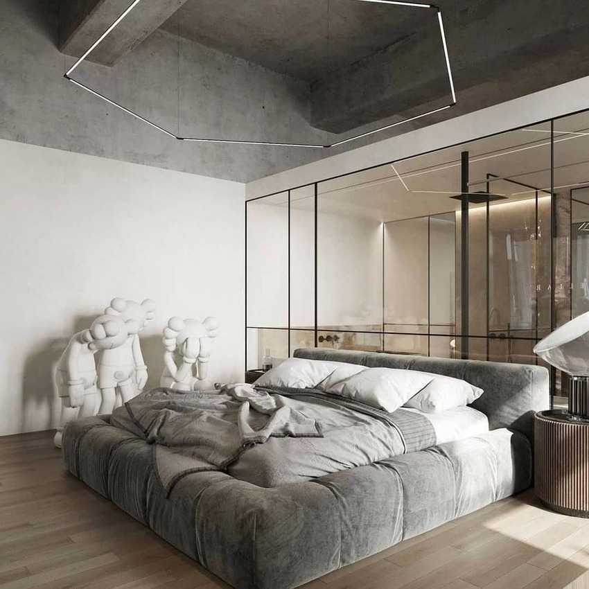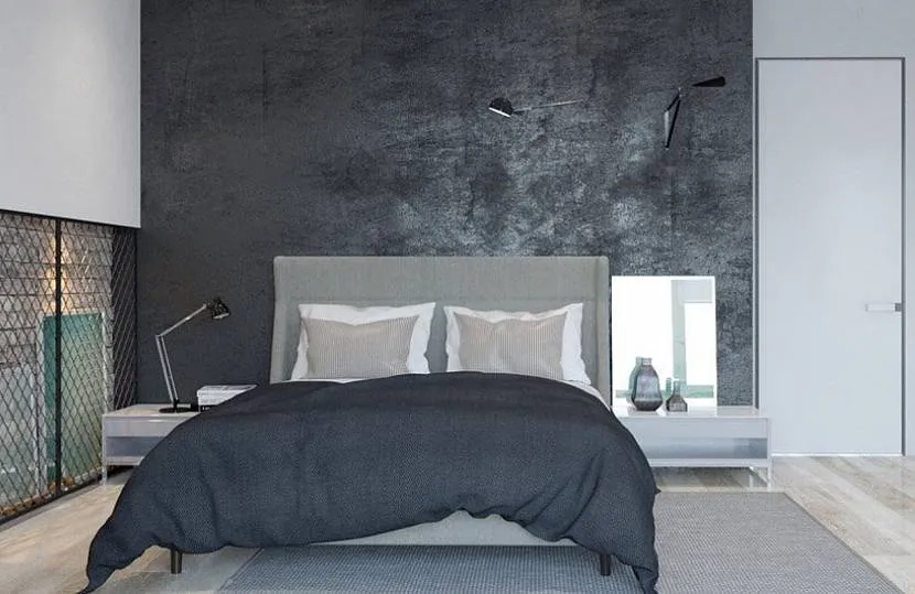 Спальню в мрачных тонах нужно хорошо осветить. Узнаваемая деталь стиля – напольный торшер, который свисает в виде дуги над столом или кроватью. Уместны потолочные лампы с лаконичными плафонами и точечные светильники на рельсах. Встроенные в стены панели подчеркивают геометрию пространства.