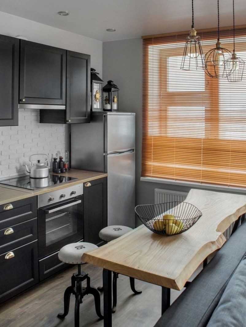 В интерьере студии в стиле лофт принято отказываться от столовой группы в пользу острова с барной стойкой или просто барной стойки. А вместо кровати чаще всего мы увидим здесь раскладной диван в качестве спального места.