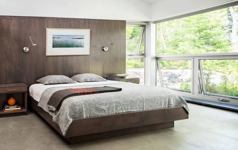 Роскошно смотрится участок для сна, оборудованный возле окна. Огромное ложе на подиуме переходит в подоконник. Предмет интерьера соединяет функции кровати и места для развлечений. От основного пространства участок отделяют ширмой, стеллажом или полупрозрачной перегородкой.