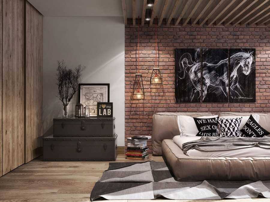 В брутальной комнате молодого человека украшения сведены к нулю. Текстиль уместен только в качестве постельного белья или обивки дивана. Если помещение холодное, то на пол кладут простой ковер без ворса. Стены декорируют абстрактной картиной или панно из металла (древесины).