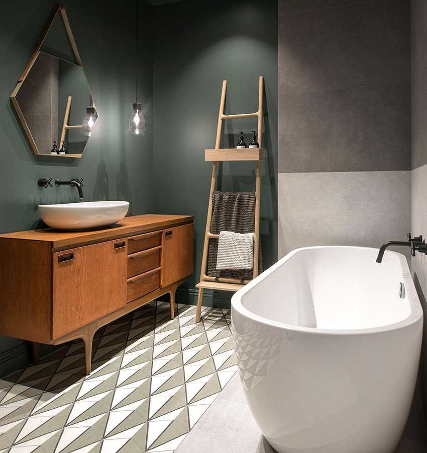 Для ванной в скандинавском стиле популярно сочетание серых и зеленых цветов