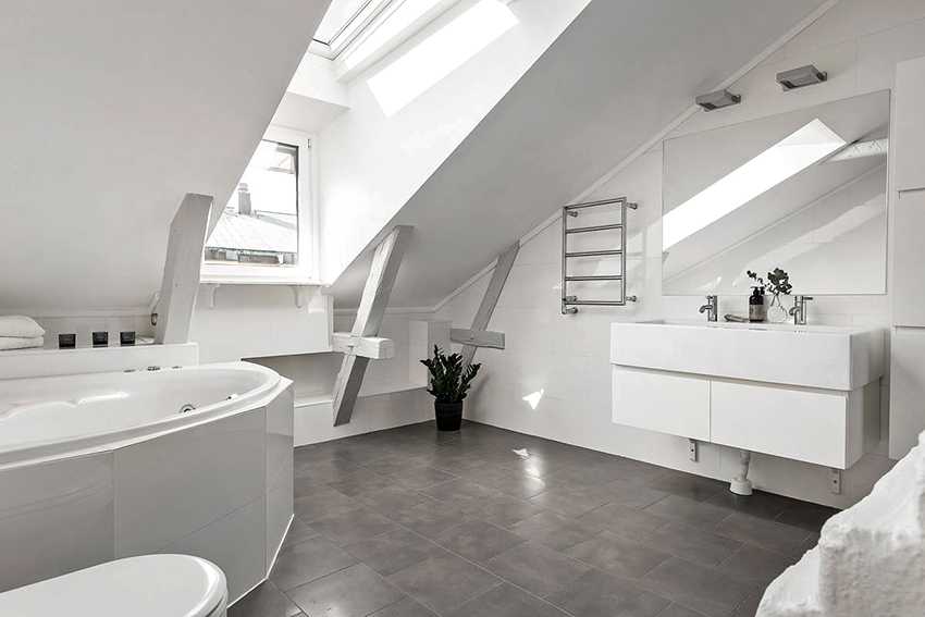 Белые стены и черный пол – очень популярный тандем, имеющий много сторонников и почитателей. Такое сочетание весьма типично и традиционно для скандинавского стиля в интерьере ванной комнаты. Белые стены могут быть оформлены как плиткой, так и штукатуркой, покрытой специальной краской.