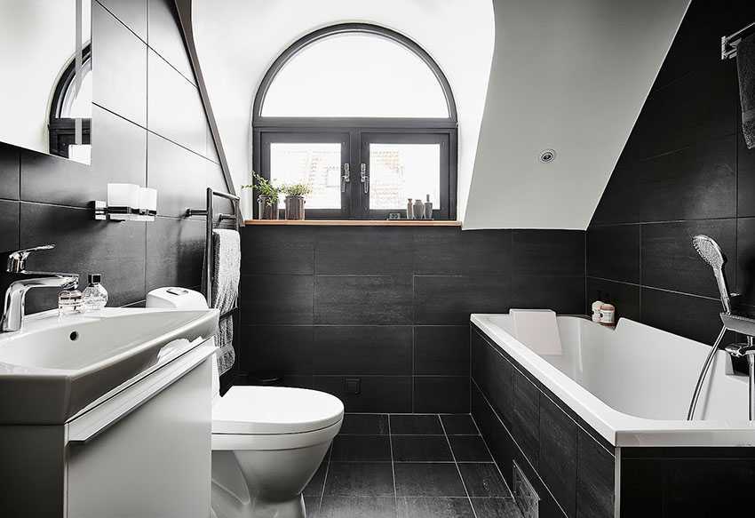 Ванная в скандинавском стиле может быть оформлена в контрастных оттенках