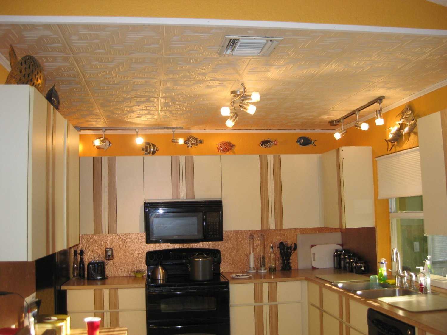 - потолочная плитка — самый экономичный вариант оформления потолка. Плитка из пенополистирола хорошо скрывает все видимые дефекты вертикальной поверхности. Для оформления лучше выбирать ламинированную плитку, она легко моется, слабо реагирует на воздействие ультрафиолета даже если окна кухни выходят на юг;