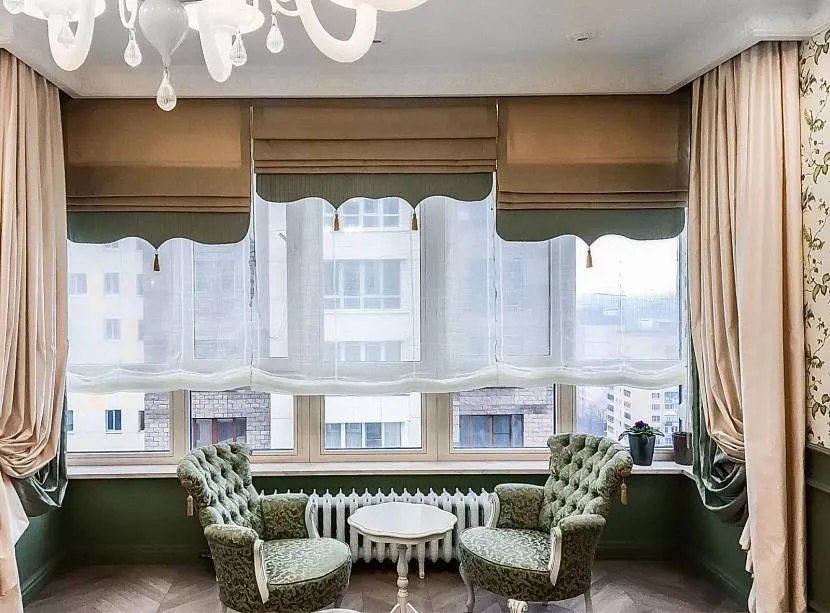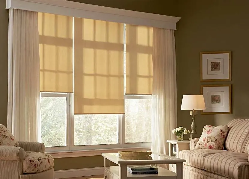 В сочетании с тюлем такие шторы создают гармоничное сочетание. В собранном виде полотно украшает оконный проем, а тюль мягко рассевает дневной свет. В вечернее время римские шторы защищают комнату от посторонних глаз. Материал полотна должен сочетаться с оттенком и рисунком мебели и отделки. В гостиной комплект можно дополнить не только тюлем, но и роскошными портьерами.