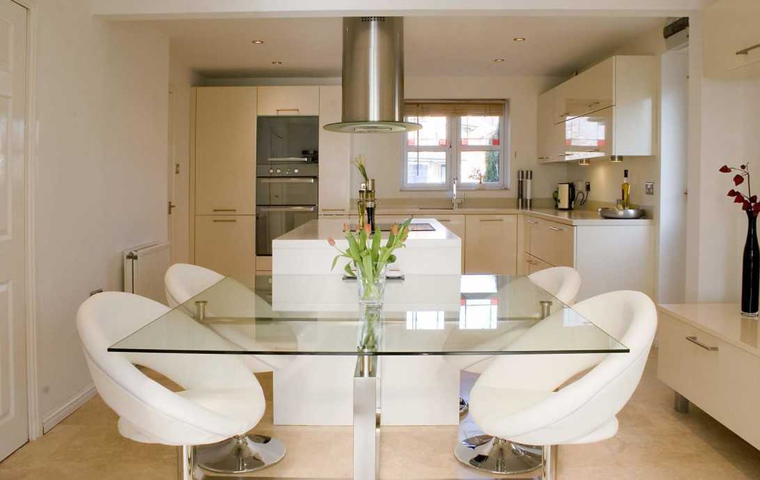 Круглый стол отлично подойдет и для кухонного помещения. К преимуществам использования обеденного стола со столешницей округлой формы необходимо отнести удобство размещения за ним всех членов семьи.