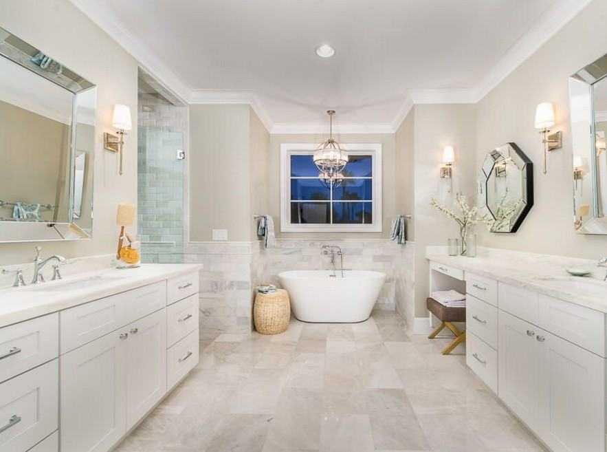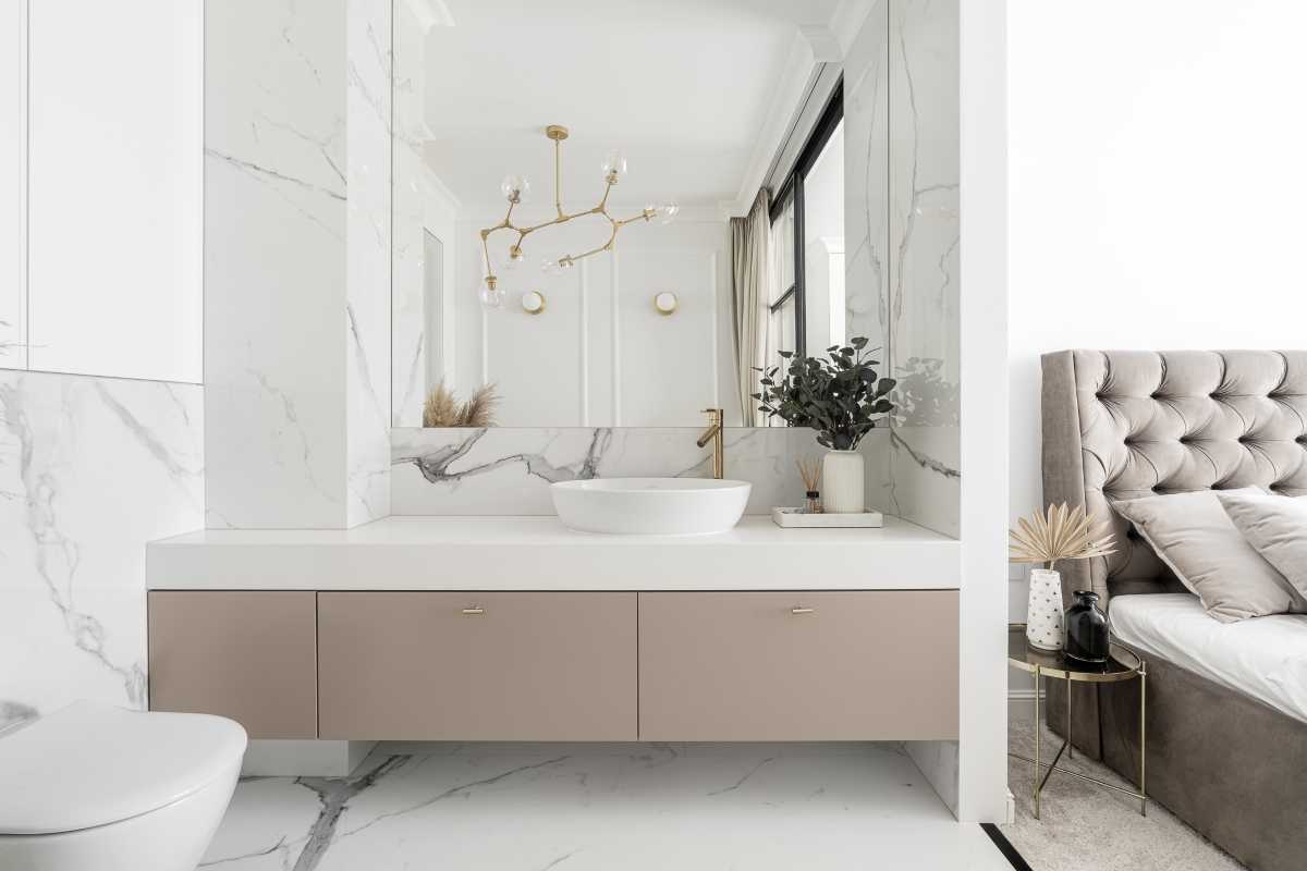Если вам кажется, что такой «мраморно-золотой» на фото, подход к делу, может утяжелить пространство, используйте в своем дизайне правильное освещение. Галогенки и люстры, которые внешне имитируют свечи, добавят изящества и легкости, а стеклянные дверцы, обилие зеркал прибавят помещению воздушности.
