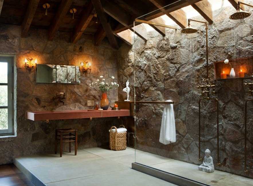 - Идеальный вариант покрытия пола – мелкая кафельная плитка для ванной комнаты, которая имитирует кирпич или камень