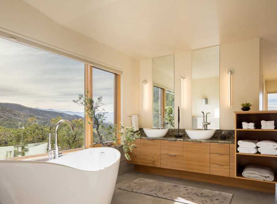 К этому проекту, безусловно, предъявлялись высокие требования. В этом случае ванная комната представляет собой одно пространство со спальней. Их разделяет только остекление. В такой ситуации санузел должен визуально сливаться с сопровождающим его помещением.