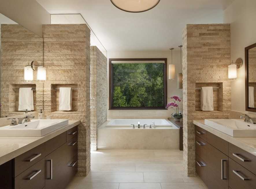 Коричневый. Оформление ванны в этом цвете дает волю фантазии. Как минимум потому, что у коричневого много оттенков: бежевый, оливковый, шоколадный, глиняный и так далее, поэтому каждый выберет на свой вкус. Популярность этого цвета обусловлена актуальностью эко-стиля, потому что коричневый цвет символизирует натуральные материалы, например, дерево, которое сейчас так же популярно, как и камень. К тому же, в одном интерьере можно сочетать несколько разных оттенков, чтобы создать более интересный и сложный дизайн.