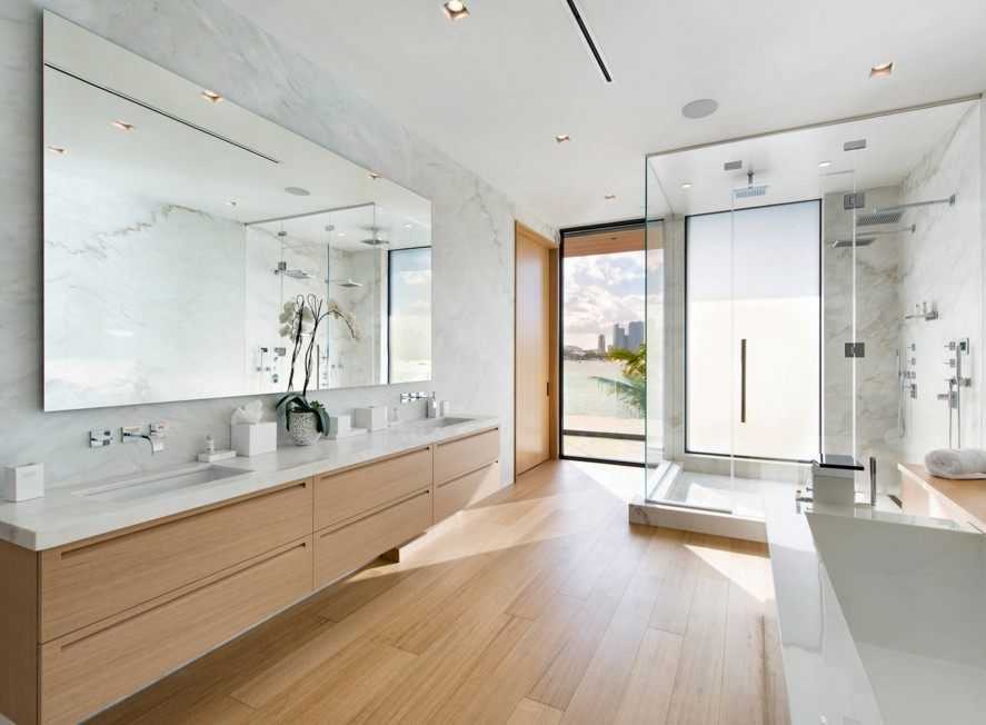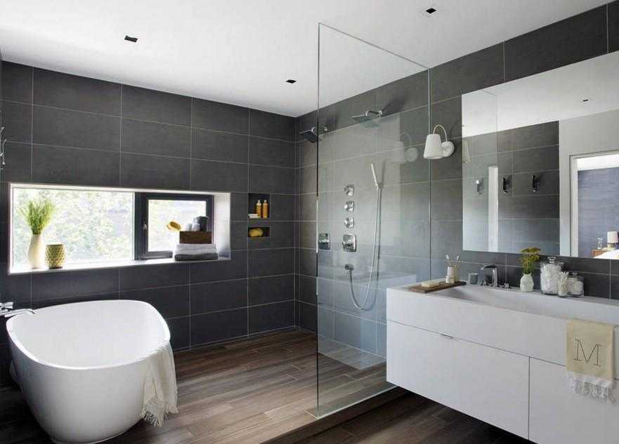 - Модная ванная комната в современном стиле характеризуется минималистичным дизайном, сдержанной цветовой гаммой и понятными лаконичными формами. Отлично впишется в современную ванную умная техника и даже телевизор.