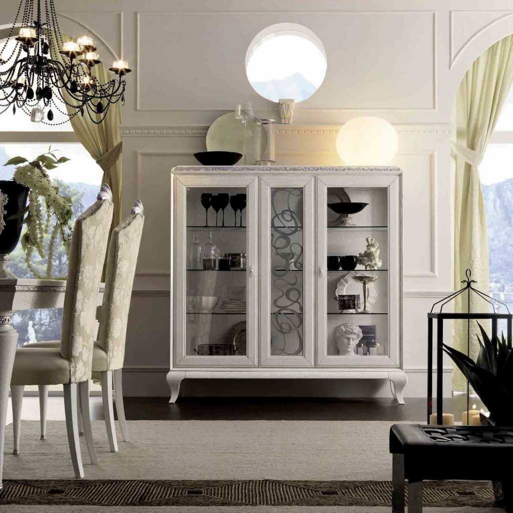 - витрина – шкаф полностью оснащен стеклянными фасадами и открыт для просмотра сверху донизу, поэтому кастрюлям и сковородкам в таком шкафу не место, хозяева используют его как элемент для декорирования кухни, выставляя на полочки коллекционные вазы, сервизы, сувениры;
