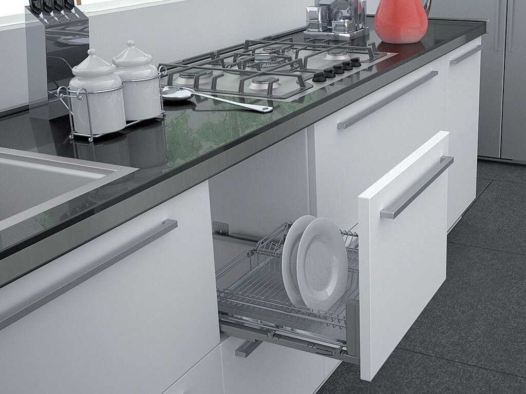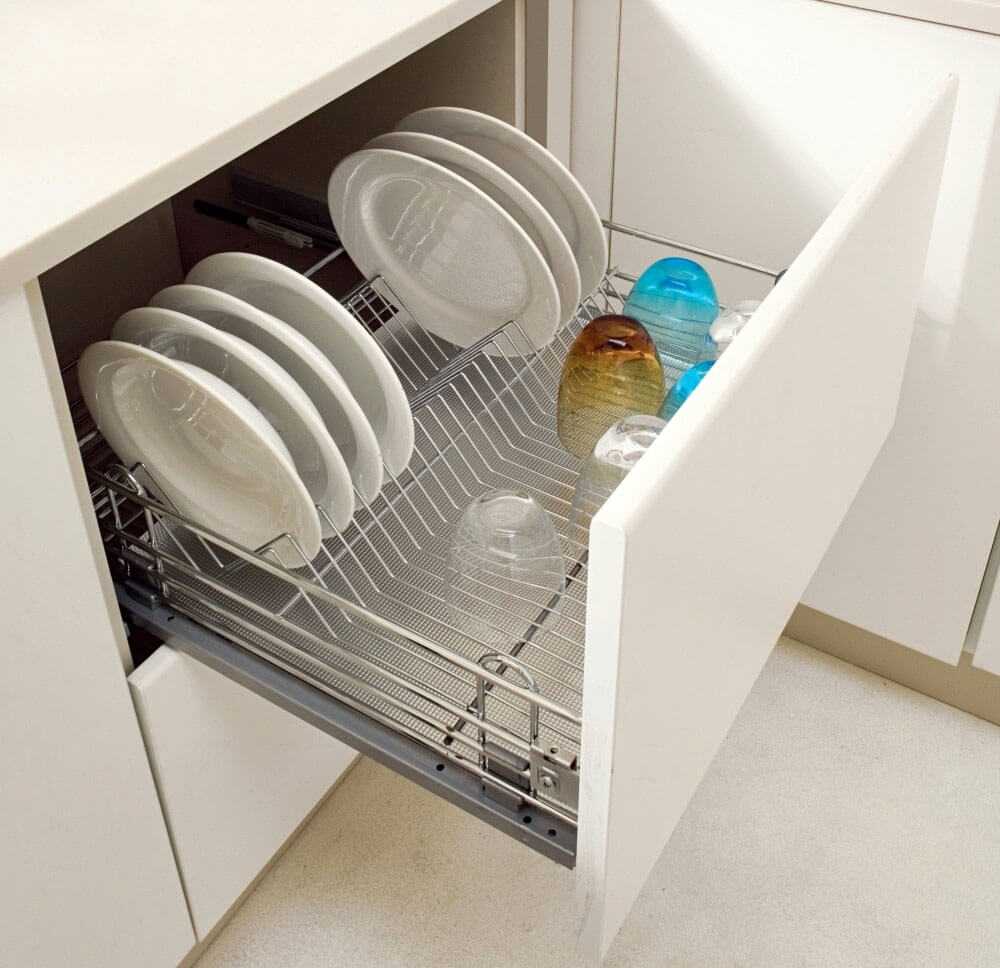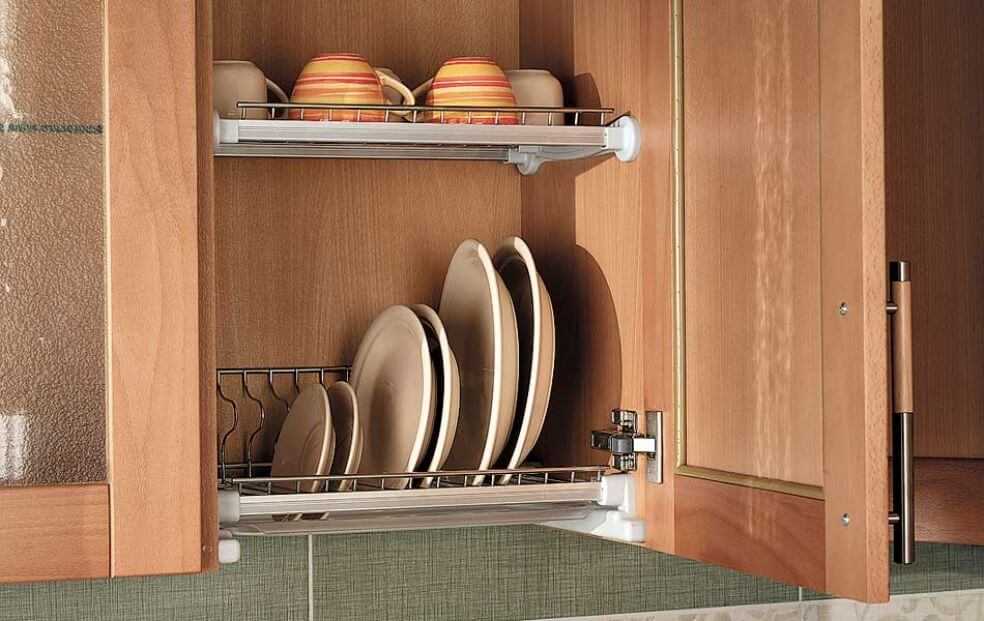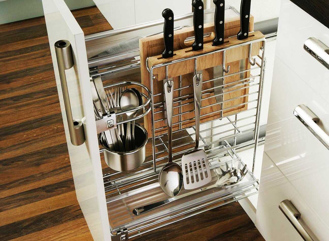 Также важно, чтобы ее можно было без сложностей доставать из шкафов. Кроме того, есть приспособления, которые помогают упорядочить посуду и столовые приборы на кухне