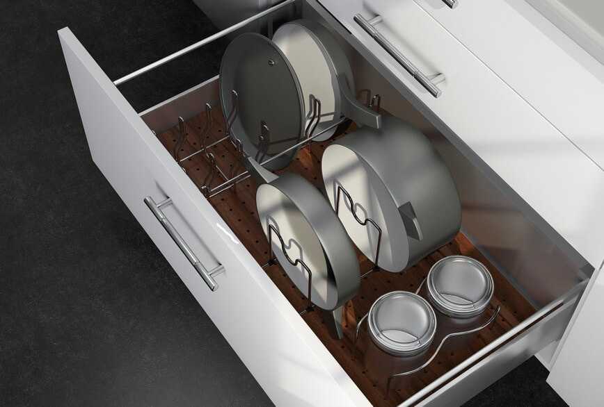 Существуют и более креативные идеи: хранение крышек вертикально, на крючках или специальных стойках. Встречаются шкафы с двойным ящиком: нижним, емким, для кастрюль и верхним — для крышек.