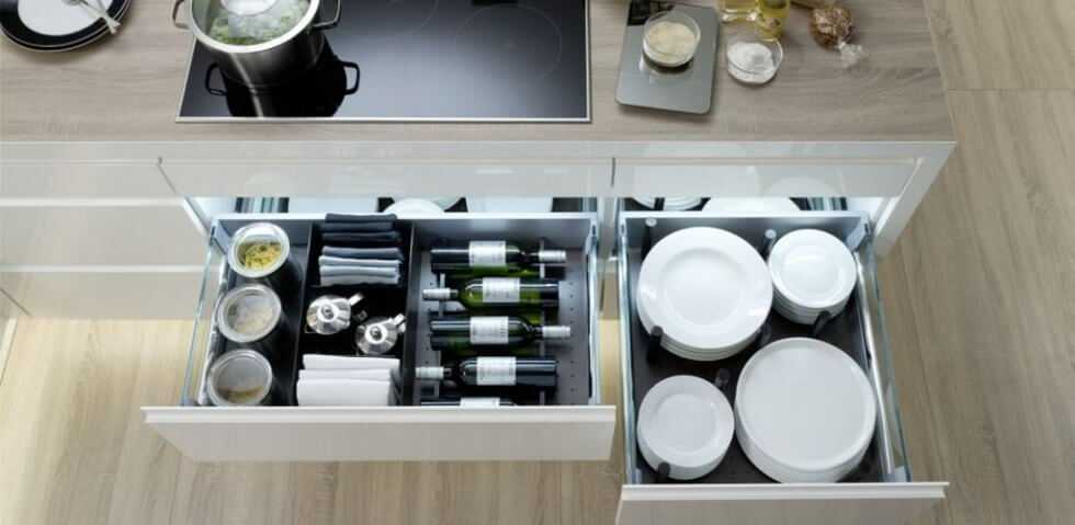 Столешницу стараются держать пустой, а многочисленные ложки и вилки хранят в выдвижном ящике, в удобном контейнере, разделенном на секции.