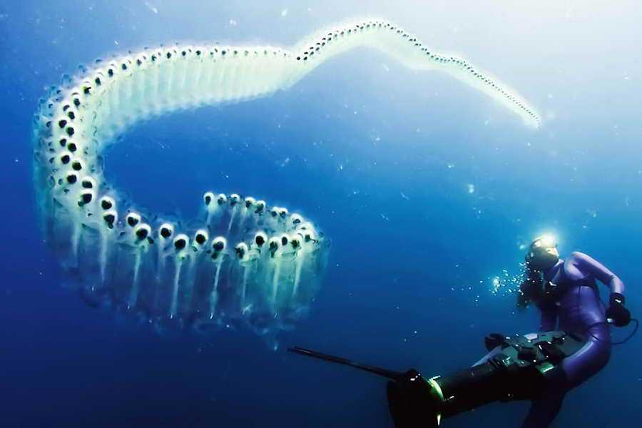 Свободноплавающие морские существа сальпы, обитающие главным образом в поверхностных водах океана (до глубины в несколько сотен метров), иногда образуют огромные скопления. Хотя выглядят эти живые организмы как медузы, структурно они считаются древними предками всех позвоночных животных. Сальпы имеют бочкообразную форму и относятся к зоопланктону. При этом эволюционно гораздо ближе к человеку — они хордовые, как и мы с вами.